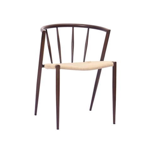 Tyylikäs ruokapöydän tuoli. Ruskea tekonahkaverhoilu ja mustat metallijalat.