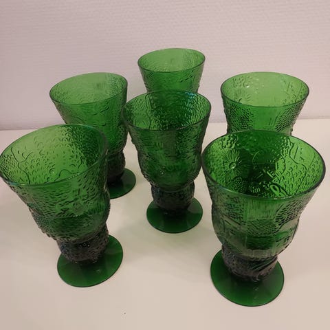 Nuutajärven Lasitehtaalla 70-luvulla valmistetut Oiva Toikan suunnittelemat Faunasarjan olutlasit, vihreät, 7 kpl. Noudettava en pysty lähettämään.