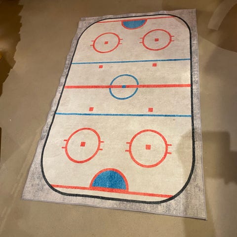 Jääkiekkokenttä -matto, jossa on kentän kaavio valkoisella painatuksella mustaharmaalla pohjalla. Pehmeä matto lätkäfanin huoneeseen.