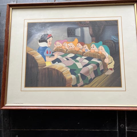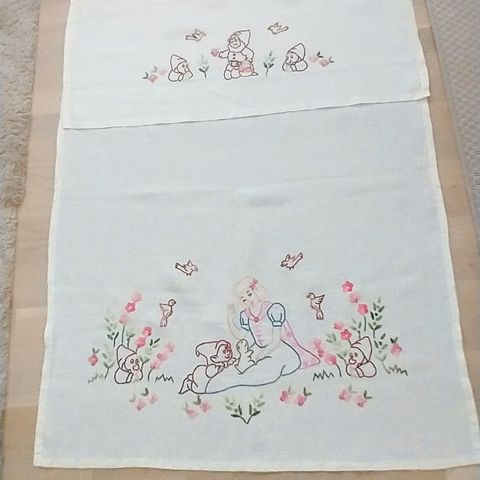 Disneyn Lumikki ja seitsemän kääpiötä -kangasbanderolli. Voi laittaa esim. seinälle. Säilytetty viikattuna.