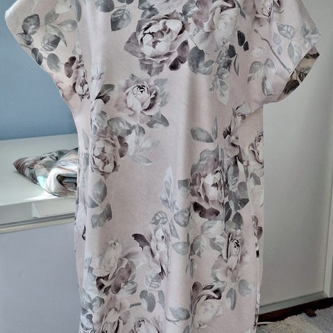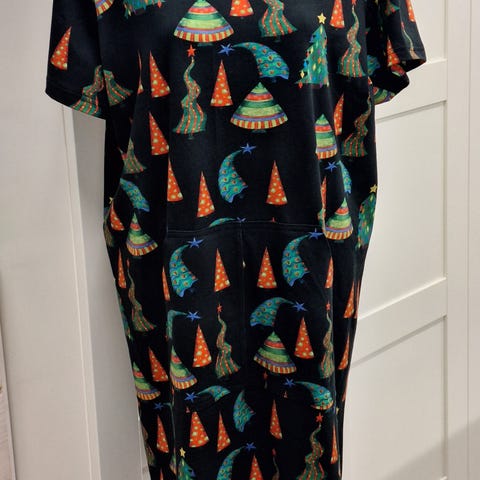 Myydään siistit joulukuusiaiheiset trikoomekot. Pohjaväri tummansininen, puuvillalycra. Toisessa mekossa lyhyet ja toisessa pitkät hihat.