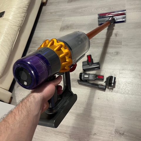 Dyson V15 akkupölynimuri, varustettuna useilla harja- ja lisäosilla.