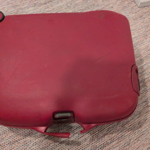Käsimatkatavarat, joissa on vaurioituneet pyörät ja kotelo. Voit korjata ne itse. Sopii taidenäyttelyyn, teatteriin, säilytyslaatikkoon jne.