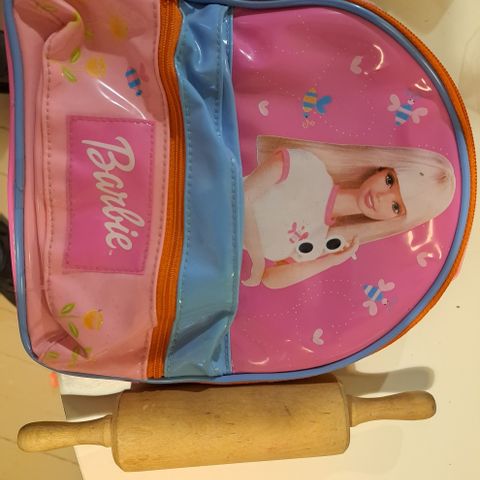 Ihana lila-pinkki Barbie-reppu. Pehmustetut olkahihnat. Barbien kainalossa mustetekstiä, tarttunut kaapissa jostain. Muutoin käyttämätön ja siisti, vaikka tarharepuksi.