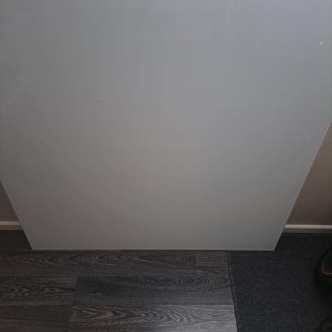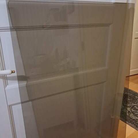 200 cm x 90 cm lasi, 5mm paksu, jossa vähän naarmuja. Lisäksi kahdessa nurkassa pieni lohkein. Kuvassa näkyy.