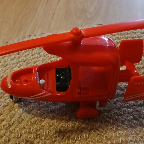 Postimies pate helikopteri lelu soi, mutta patterit aika lopussa. Valo palaa ja propelli pyörii kun lelua ajaa.