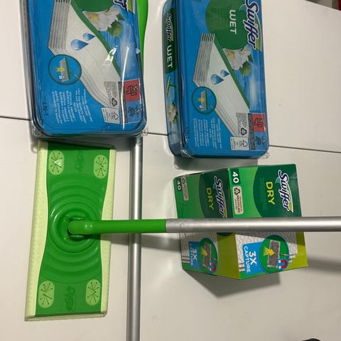Vähän käytetty ihanan kevyt vaaleanpunainen Swiffer:n kokoontaitettava moppi ja 7 kosteaa/märkää lattialiinaa.
