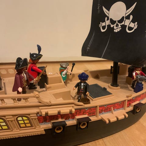 Hyväkuntoinen merirosvosetti. Kaikki alkuperäiset osat tallessa, paitsi yksi kirves joka korvattu pistoolilla. Toimivat tykit, neljä ammusta. Purjeen kiinnitys vahvistettu ruuvilla.