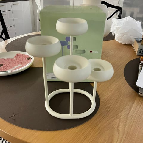 Myynnissä valkoinen Iittalan Nappula kynttelikkö hintaan 88e. Kynttelikkö on muuten moitteettomassa kunnossa, paitsi että yksi kohta (näkyy viimeisessä kuvassa) on korjattu maalilla. Nouto Askolasta tai postitus L-pakettina + 14,50e. MMM, koiratalous.