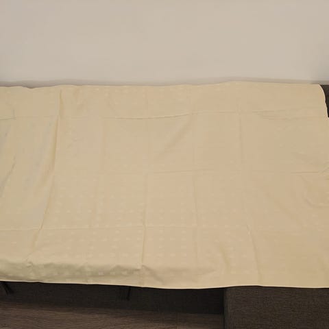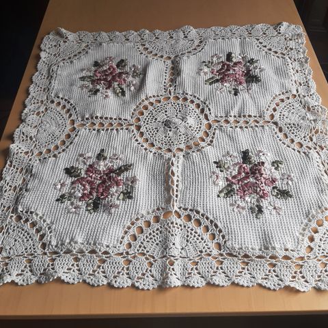 Pöytäliina, jossa on kukka- ja geometrisia kuvioita. Kangas on valmistettu kevyestä materiaalista ja soveltuu esimerkiksi kodin sisustukseen tai käsityöhön.