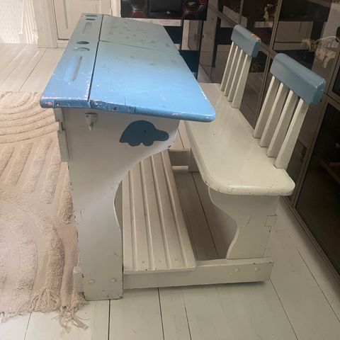 Myydään vanha kahdenistuttava pulpetti. Vaalea vihertävänkeltainen väri. Muuten kunto hyvä, mutta käytönjälkiä löytyy.