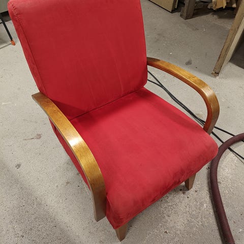 Annetaan nojatuoli raheineen. Ollut koirataloudessa, joten kangas on saanut reippaasti osumia.