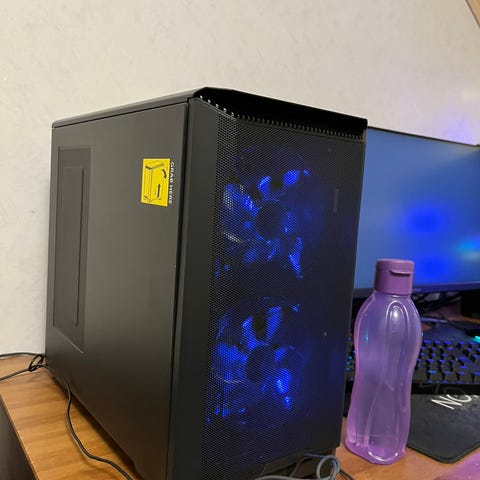Phanteks itx kotelo, tuuletin ja pci riser näytönhjaimelle. Kaksi usb liitintä ja virtakatkaisin emolevyn liitäntöihin.
