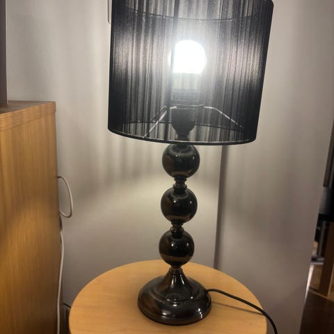 Pöytävalaisin musta, valmistettu muovista. Valaisimen korkeus noin 40 cm, pohjan halkaisija noin 15 cm. Mukana TekPac-adapteri, jossa lähtöjännite 12 V ja lähtövirta 0,5 A.