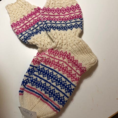 Kotikulta tuokio langasta ( 75% villa 25% polyamidi) tehty , terän pituus n 26cm , varren pituus n 15 cm, koko n 42/43