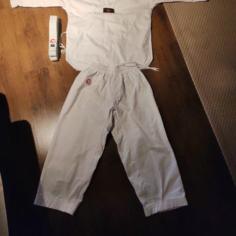 Kamppailulajit lasten puku, koko 174. Puku on tarkoitettu kamppailulajien harjoitteluun ja kilpailuun. Materiaalista ei ole tietoa.