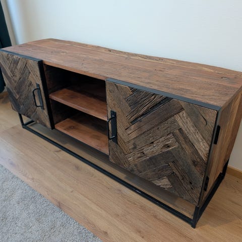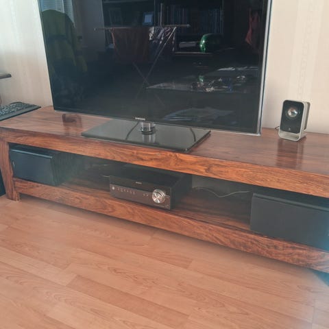 Valkoinen täyspuinen TV-taso. Käytönjälkiä.