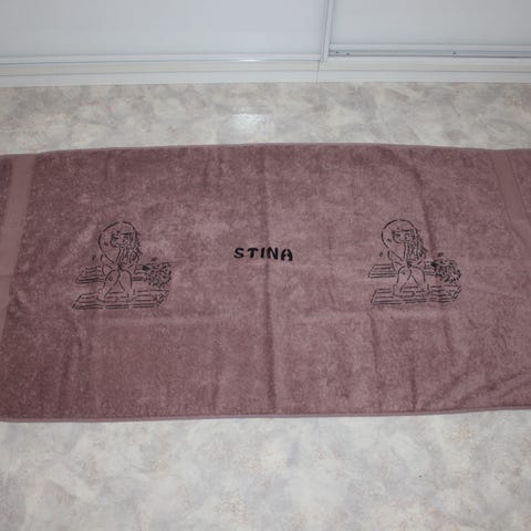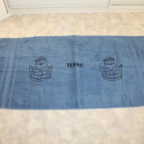 Uusi petroli värinen 70x140cm pyyhe, käsinpainettu sauna aiheinen kuvat.