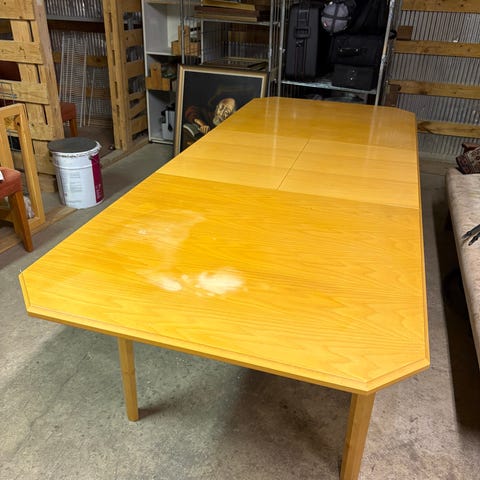 Dc fixillä päällystetty jatkettava ruokapöytä. Jalat maalattu kalkkimaalilla. Alkuperäinen väri näkyy kuvissa. Dc fix lähtee helposti irti.