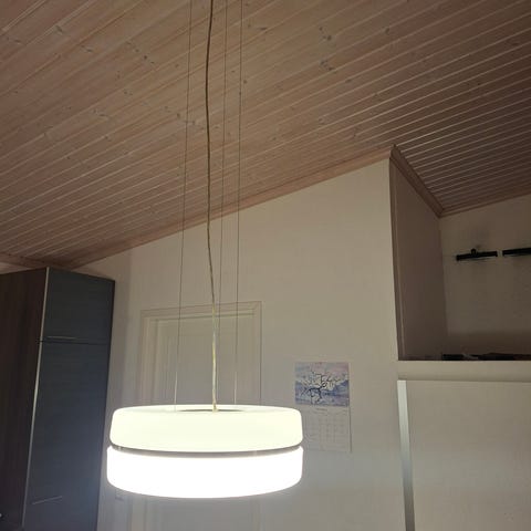 Riippuvalaisin, jossa valkoinen varjostin ja kristallikoristeet. Valaisin on suunniteltu kattokiinnitykseen ja se sisältää useita lasikristalleja koristeena.