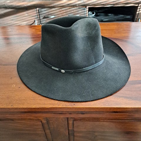 Käyttämätön, tyylikäs, musta Stetson hattu korvaläpillä.