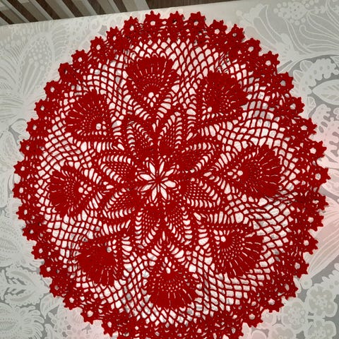 Kalastajalangasta virkattu liina. Suorakaiteen muotoinen kulmat pyöristetty ja keskileveyttä pyöristäen lisätty, keskellä ruusu-seppele. Symmetrinen , hyvin istuva pitsipöytäliina.