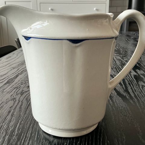 Arabia Pekka Maitokannu piippuleimalla eli aikakaudelta 1934-1949. FQ-malli otettiin käyttöön v. 1910, Pekka-koriste, eli lasitteenalainen kobolttiraita, tuli käyttöön v. 1934.