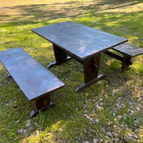 90-luvulla rakkaudella käsintehty pirttipöytä kiintein penkkeineen. Penkkien korkeus 40cm.