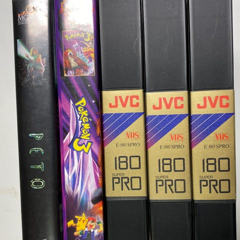 Kokoelma erilaisia VHS-kasetteja, sisältäen useita elokuvia ja animaatioita. Kasetit ovat fyysisessä muodossa ja sopivat VHS-soittimille. Kokoelmassa on useita eri nimikkeitä ja genrejä.