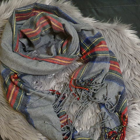 Myytävänä hapsullinen kaulahuivi pehmeästä materiaalista