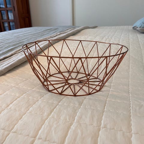 Vanha vintage messinki kori. Kauniisti ajan patinoima. Pituus noin 9,5cm ja korkeus sangan kanssa noin 7,5cm.