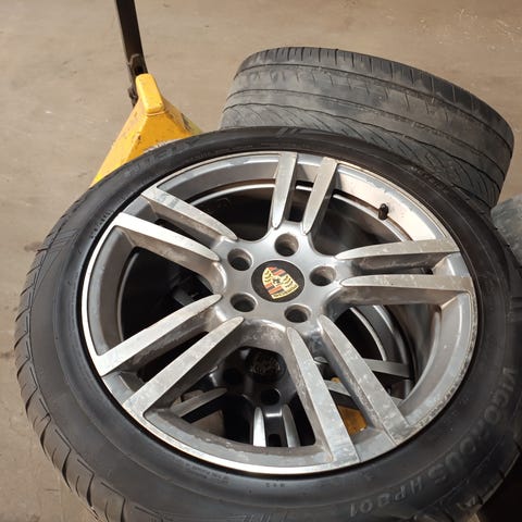 Porschen alkuperäiset 9"x20" et57, päällä hyvin vähän ajetut Nokian Hakkapeliitta 9:t 275/45r20. Yhdessä vanteessa pieni jälki puolassa josta kuva. TPMS anturit on Porschen alkuperäiset ja toimivat. Pahoittelen huonoa kuvaa likaisista vanteista, talliin ei tule nyt vettä pesua varten. Jos hinta ei ole mielestäsi kohdallaan niin tee tarjous.