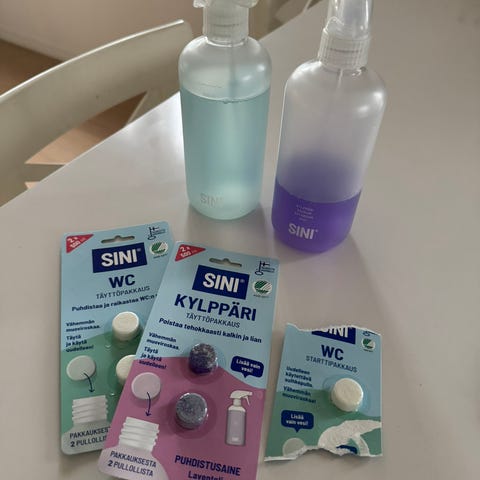Sini-tuotemerkin vaaleansininen ikkunapesin ja lattiapesimen osa (myyty). Myynnissä Lohjalla, mutta kulkeutuu omien menojen mukaan ilman postimaksua Kamppiin, Espoon keskukseen ja Espoon Ikealle. Myynnissä myös muualla. Hp. 5 euroa/kpl.