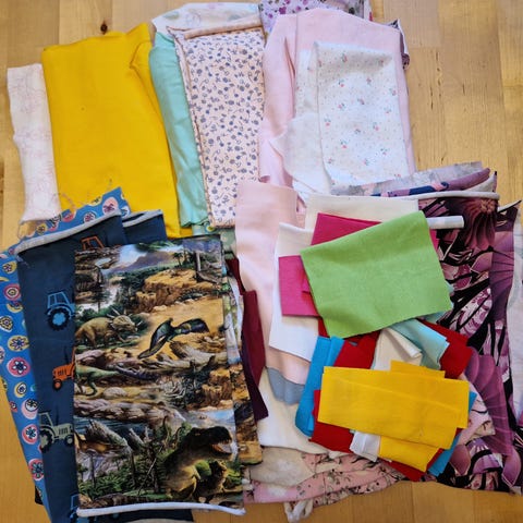 Erilaisia isompia kankaita ja pienempiä tilkkuja mukavan kokoinen määrä. Mukana materiaaleja laidasta laitaan, hyvässä kunnossa! Ei haluaisi roskiin heittää joten jos jollain vain on käyttöä.