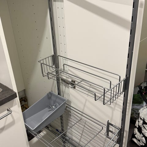 Siivouskaapin sisäosa liukukiskolla. Tuo siivoustarvikkeet näppärästi esille ja lisää siivouskaapin käyttömukavuutta