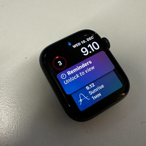 Hyväkuntoinen Apple Watch SE GPS 44mm älykello kangasrannekkeella.