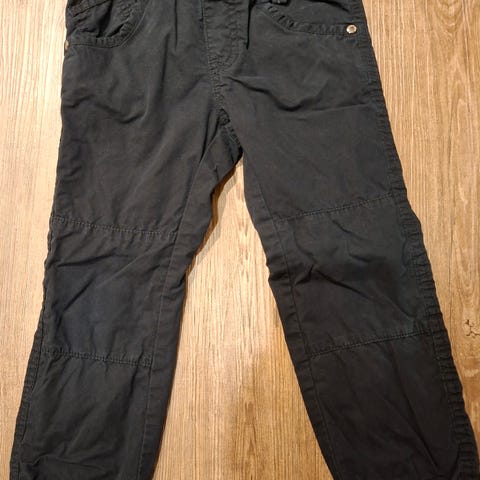 KappAhl 104. Mustat. Hyväkuntoiset (vähän käytetyt). Vaikea saada yksityiskohtia kuvaan, mutta polvien ylä- ja alapuolella muotolaskokset sekä reisien sisäpuolella lisäkappaleet. Takana "chinohousujen tyyppiset" valetaskut. Vyötäröllä säätömahdollisuus. Näihin kuului muistaakseni mustat henkselit (pienillä punaisilla yksityiskohdilla), laitan ne myös ostajalle mukaan.