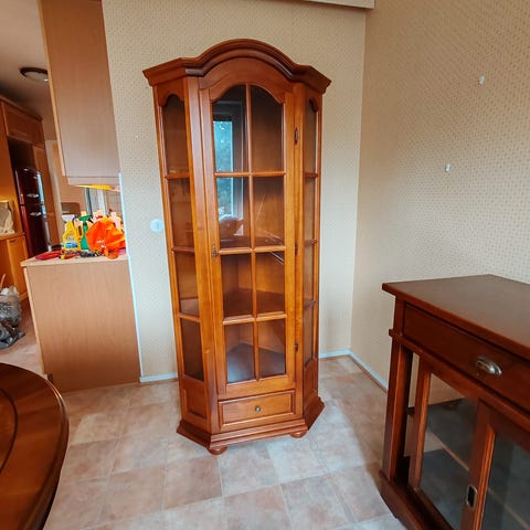 Korkea 205cm,valkoinen astiakaappi lasiovella. Lasissa huurrekuvio.