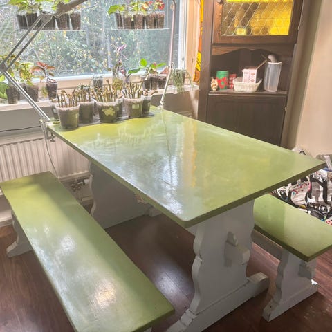 Vanha pirttikalusto, maalattu valkoiseksi. Käytön jälkiä löytyy, mutta siisti.