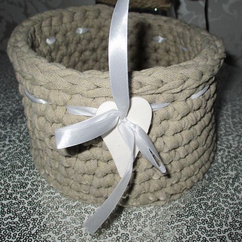 Käsityönä tehty virkattu kori, joka on valmistettu harmaasta ja vaaleanpunaisesta langasta. Korin materiaali on pehmeä ja joustava. Soveltuu säilytykseen ja sisustuselementiksi.Jokainen pala on 10 cm korkea ja niiden halkaisijat ovat 10 cm, 15 cm ja 20 cm. Kaikkien kolmen palan yhteishinta on 5 euroa.