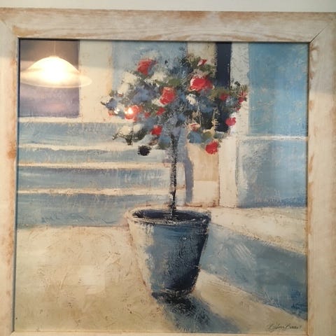 Itsetehty kokovalkoinen taulu, johon käytetty akryylimaalia, askartelupiippurasseja ja 3D-kynää.