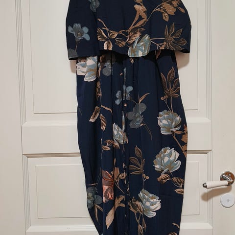 Vihreä, mustat kukat, koko L. Vähän käytetty, siisti. Materiaali; Rayon55/polyesteri45, miellyttävä päällä .koko pituus 92c, vähän joustaa. Levenee helmaan, siis ei vartaloa myötäilevä. Kai 52c. Kuminauha hihan suissa.