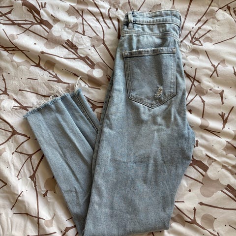mid-low waist vaaleansiniset stradivariuksen suorat farkut (mallia d03), yhdessä polvessa vähän roiske jälkiä, näkyy vikassa kuvassa. muuten todella hyvässä kunnossa!