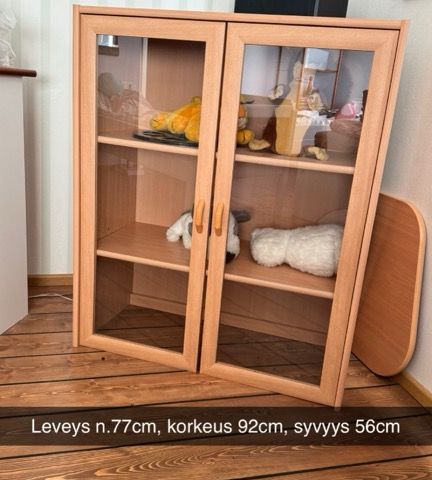 HKT Nurmela OY:n Pikantti seinävitriinit 2kpl liukulasiovilla. Lasihyllyt (6kpl) ja kannakkeet. Täysin uudenveroiset, lukuunottamatta yhden liukulasin nurkkaa jossa pieni lohkeama, tämä tosin jää aina näkymättömiin ollessa taarmpi liukulasi jonka etummainen peittää. Tilalle löytyy uudet ovilasit, jotka saa mukaan (näkyy viimeisessä kuvassa). Kaikki kiinnikkeet ja kannakkeet löytyy ja saa mukana. Yhdessä, 50€ Erikseen 30€/vitriini.