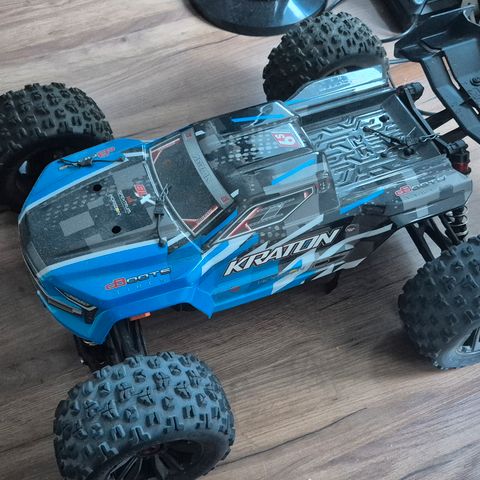 Arrma Kraton 6s RC-auto punainen ja musta väri, kestävät renkaat ja tukeva runko. Sopii maastoajoihin ja tarjoaa hyvän pidon epätasaisilla pinnoilla.