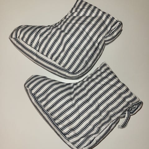 Taskuja, yhdessä taskussa sauman kohdalla repeämä