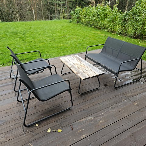 Sopii vaikka saunan terassille kalusteet.Aikoinaan (n./22v sitten tehdyn)Myyn huvimajaan tehdyn pöytäryhmän.Ollut sisällä kuivassa.Pöydän koko n.160x90