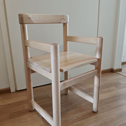 Myydään puusepän tappiliitoksin tekemä lasten puinen tuoli. Normaalia käytön jälkeä. Jämäkkä, ei nitku mihinkään suuntaan. Selkänojasta mitattuna korkeus 53cm, istuinosa 31cm, syvyys 29cm, leveys 30cm. Kova lakkapinta. Aina sisällä lämpimässä säilytetty. Ei eläintalous.