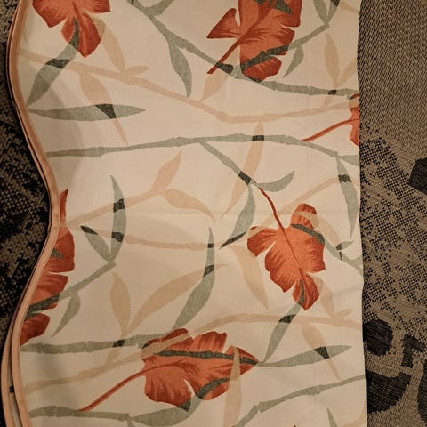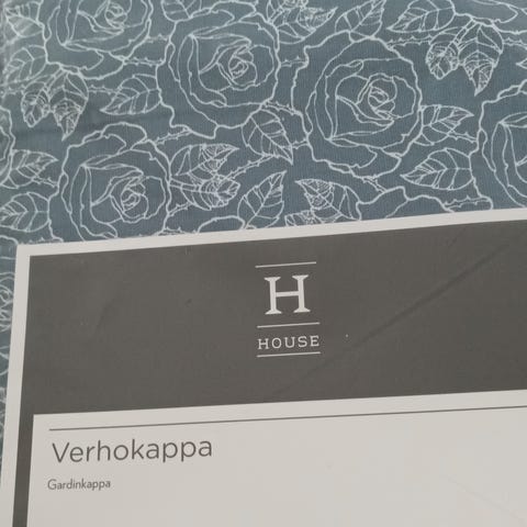Pellavasekoitteen tuntuista materiaalia. Pituus 260 x 49 cm. Siisti, pesty koneessa.
