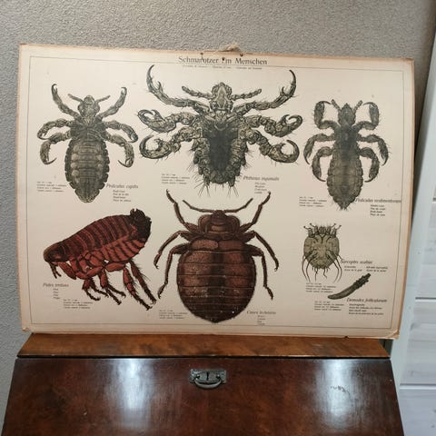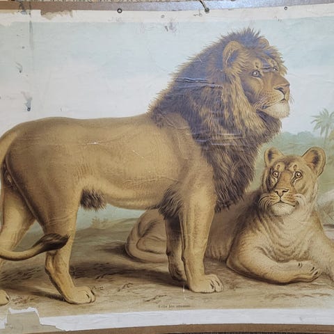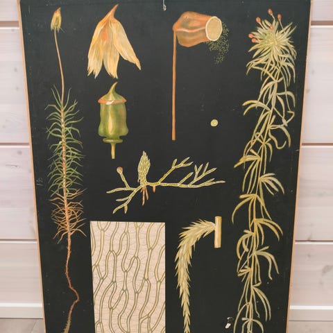 Vanha opetustaulu, eläintieteellisiä kuvia, mustekala, kuorietana ja osteri. Koulutarpeiden Keskusliike Oy.